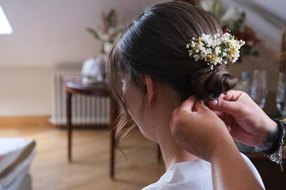 Una vez tenemos claro el diseño, y has aprobado el presupuesto, empezamos a trabajar. Cuando tenemos parte del tocado hecho, hacemos una prueba intermedia, para asegurarnos de que es lo que quieres e ir ajustando las medidas. Esto también nos permite coordinarnos con las pruebas de peluquería.